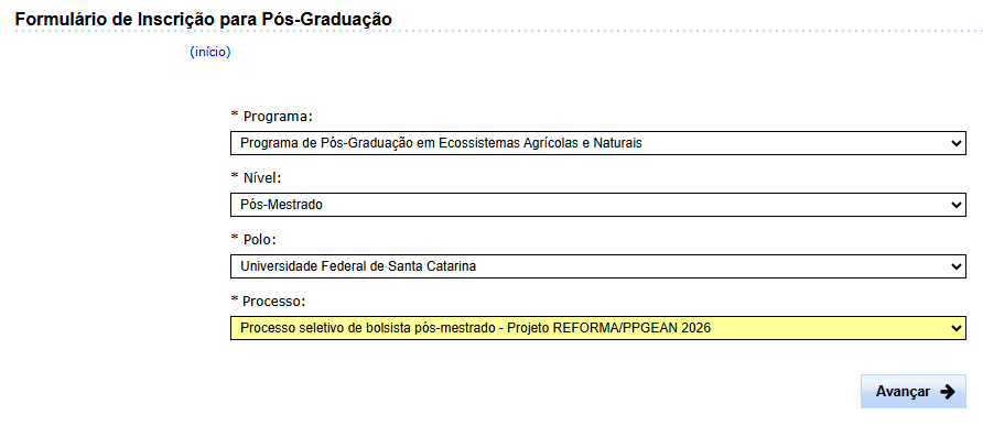 Entre os dias 20 de janeiro e 20 de fevereiro de 2026 estarão abertas as inscrições para 01 (uma) vaga de bolsista de estágio pós-mestrado no Projeto Reforma, vinculado ao Centro Reforma de Restauração Ecológica (REFORMA) e ao Programa de Pós-Graduação em Ecossistemas Agrícolas e Naturais (PPGEAN-UFSC). Poderão inscrever-se na seleção os candidatos com o título de mestre em cursos que se enquadram nas áreas de conhecimento da CAPES Ciências Agrárias I e Biodiversidade. O valor da bolsa é de R$ 3.500,00 e terá duração de 10 meses (entre março de 2026 e dezembro de 2026), sem possibilidade de renovação. As inscrições serão recebidas pelo Sistema de Controle Acadêmico da Pós-Graduação (CAPG), mediante o preenchimento do formulário disponível no endereço https://capg.ufsc.br/inscricao.